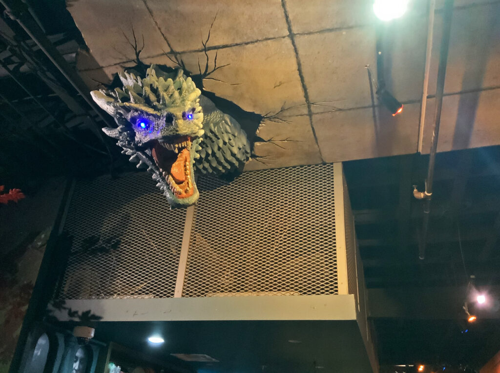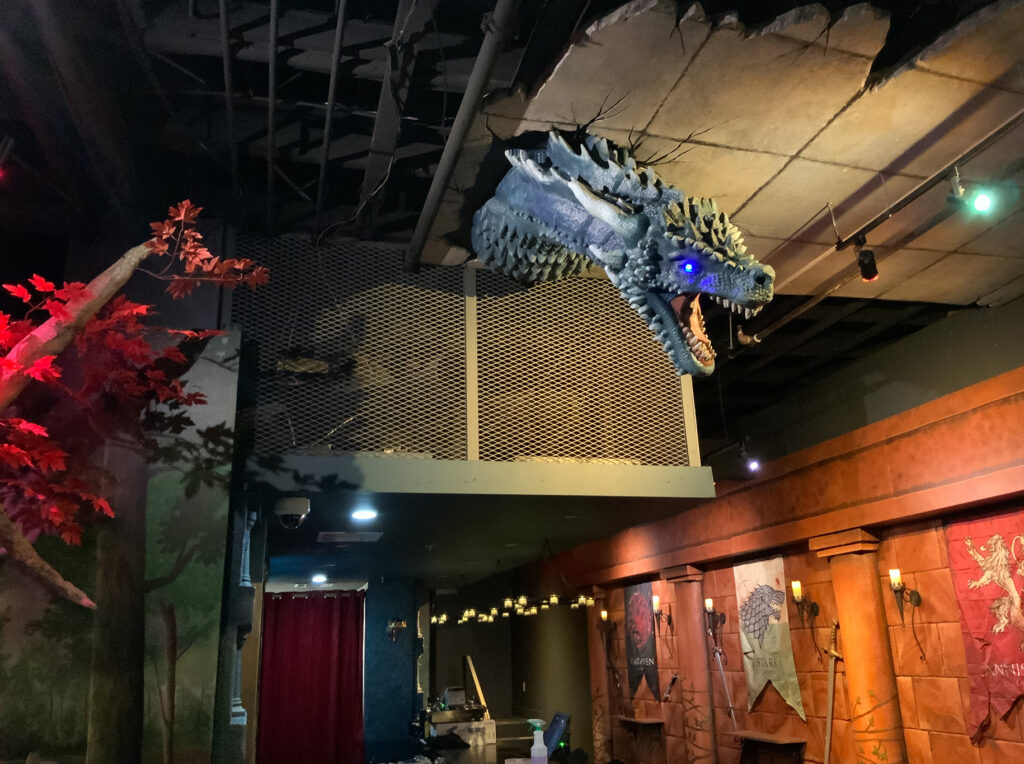 Art Seen Alliance filled the space with many hand-carved & custom-built elements: castle walls, the Weirwood tree, a dragon overhead, & of course the Iron Throne!